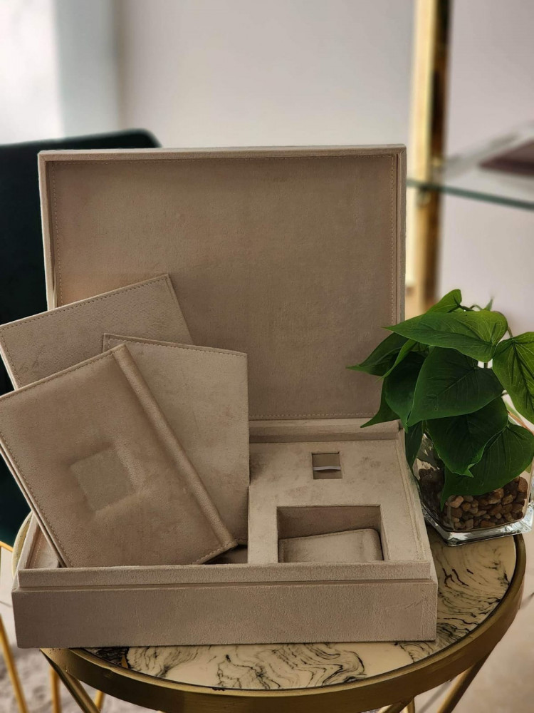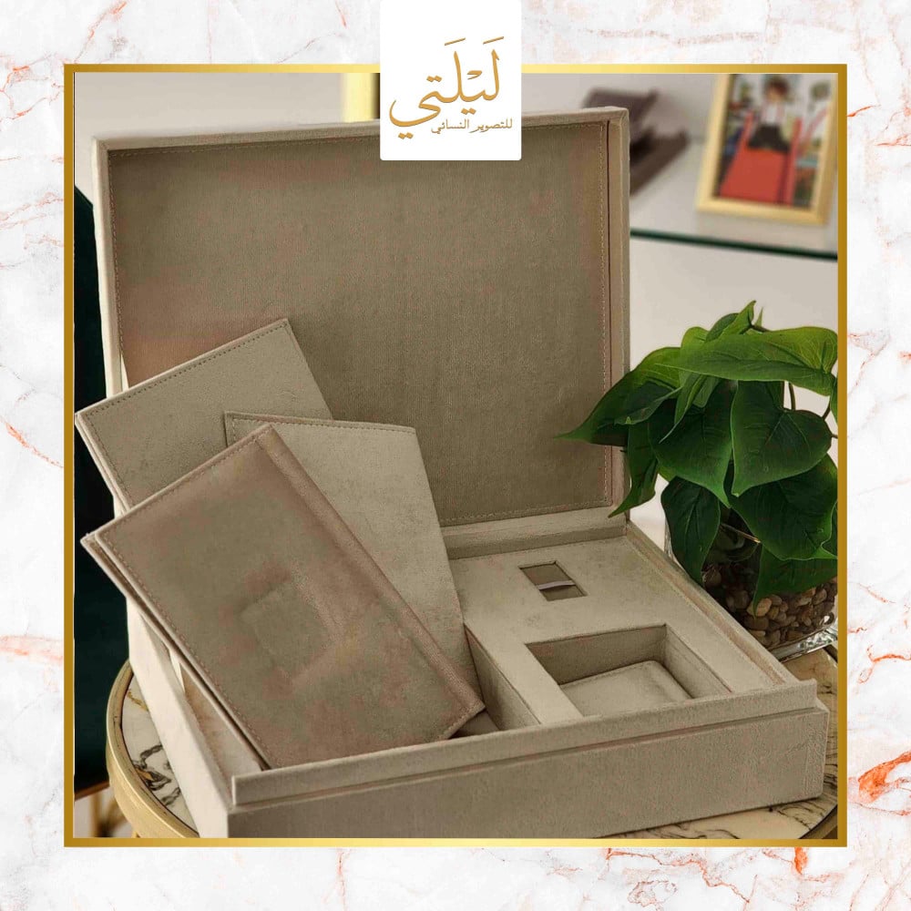 طباعة بكج البوم 22*23 تاج مربع مكون من عشرة صفحات خامة مع صندوق يحتوي على مكان لليو اس بي و المني البوم بجودة عالية الوضوح مع مطوية و مجلة كلاسيك و ومني البوم من نفس الخامة ولوحة جدارية A3 ورق طباعة مقاوم للماء احبار اصلية ضمان جودة طباعة عالية