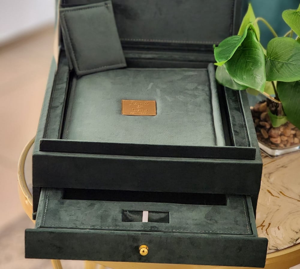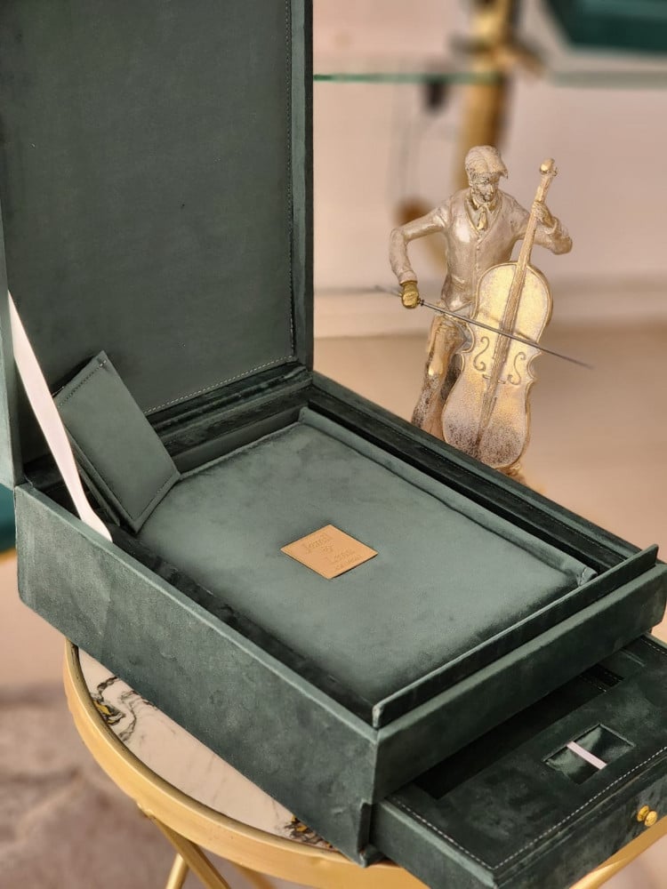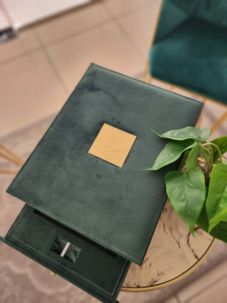 طباعة بكج مخمل اخضر البوم 30*45 تاج مربع مكون من عشرة صفحات خامة مع صندوق يحتوي على درج مكان لليو اس بي بجودة عالية الوضوح مع مطوية و مجلة كلاسيك و ومني البوم من نفس الخامة ولوحة جدارية A3 ورق طباعة مقاوم للماء احبار اصلية ضمان جودة طباعة عالية