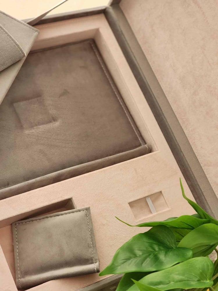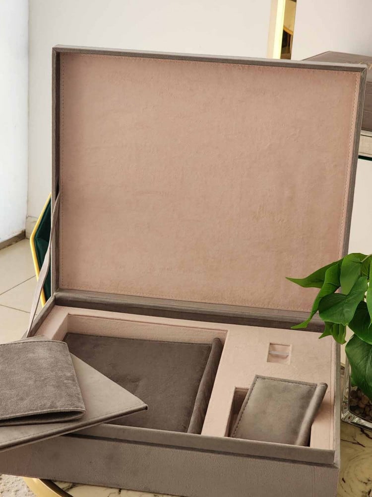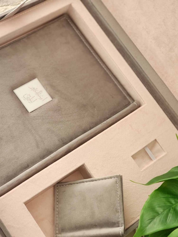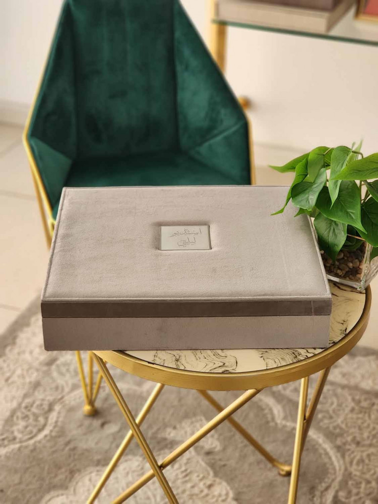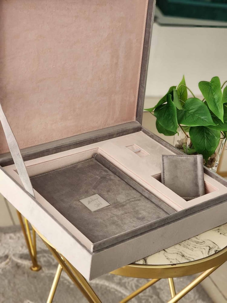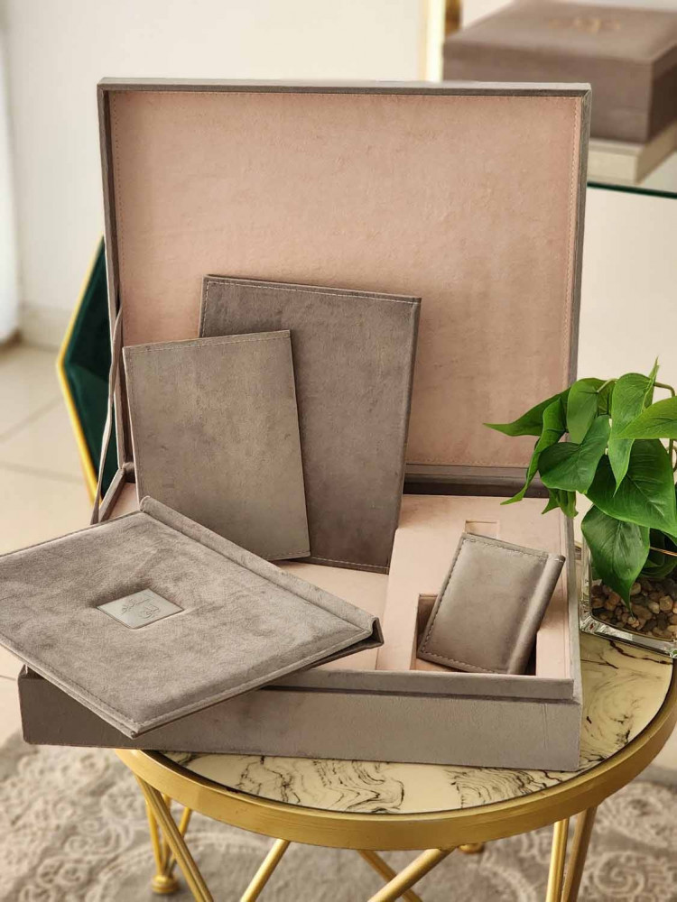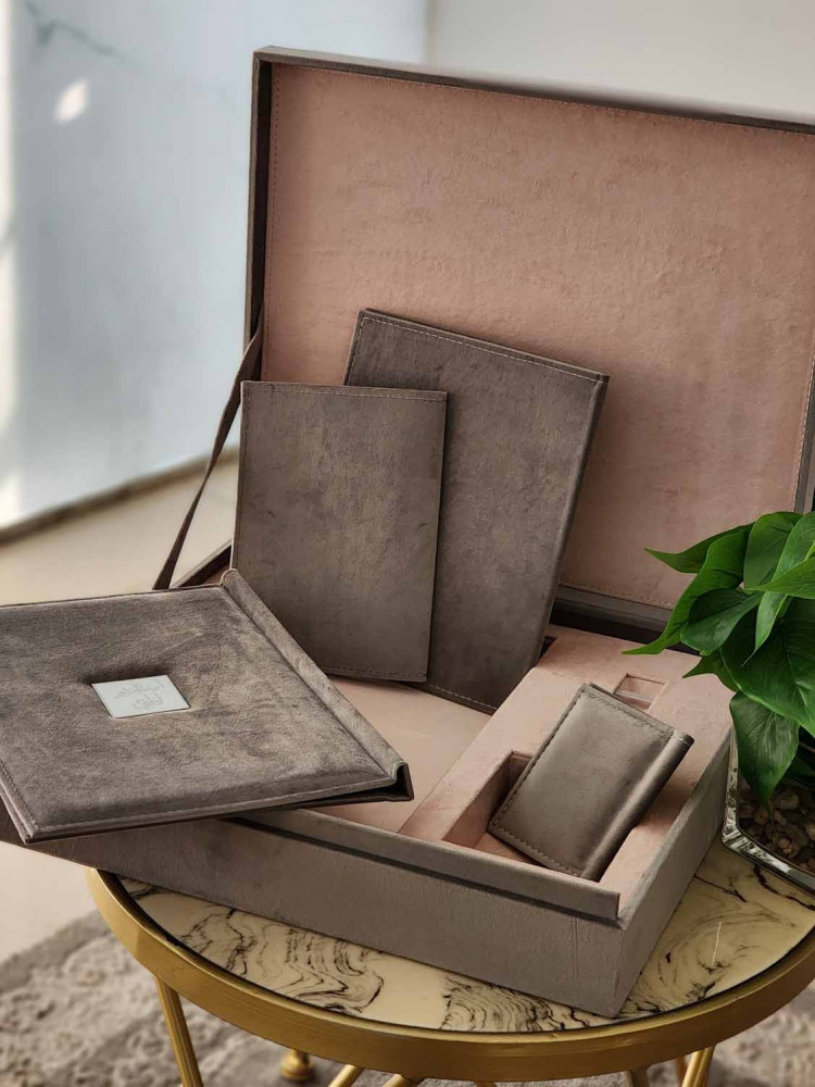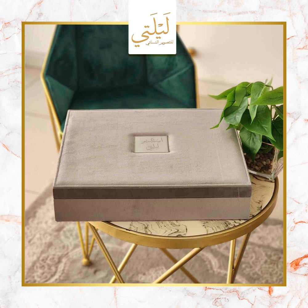 طباعة بكج مخمل مكس ا لرمادي مع بيبي بينك البوم 30*45 تاج مربع مكون من عشرة صفحات خامة مع صندوق يحتوي على مكان لليو اس بي و المني البوم بجودة عالية الوضوح مع مطوية و مجلة كلاسيك و ومني البوم من نفس الخامة ولوحة جدارية A3 ورق طباعة مقاوم للماء احبار اصلية ضمان جودة طباعة عالية